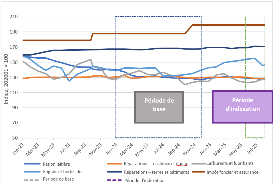 - Depuis 2024, les taux d’intérêt et les coûts associés aux aliments achetés pour les animaux ont diminué tandis que d’autres indices sont demeurés plutôt stables en 2025. Ces baisses ont eu pour effet de retrancher -0,63 $/hl unif. du CdP une fois indexé. Le graphique ci-dessous illustre la variation des indices de prix de certains coûts importants.